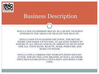 Stella Nova began as a quest to serve others in health and beauty. Its flagship location at 292 King Street is both a retail store and makeup studio, carrying top brands and its own skin and body care line. Data was pulled from Stella Nova's IT system for two weeks, one in May and one in August, to analyze top selling product lines, quantities and prices that maximize profits, and how discount rates affect sales of top products. Bare Escentuals and Bumble & Bumble were among the top sellers, with discounts and quantities sold varying between the two weeks.