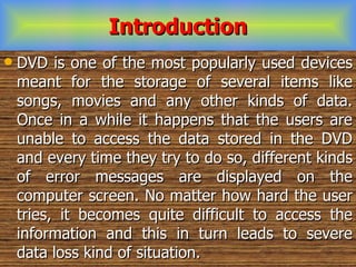 The document discusses the common issues faced by users when accessing data stored on DVDs, including accidental deletion and physical damage. It emphasizes that deleted data can often be recovered using specialized DVD data recovery software, which utilizes powerful algorithms to retrieve lost data without risking further corruption. The software is user-friendly and compatible with various Windows operating systems.