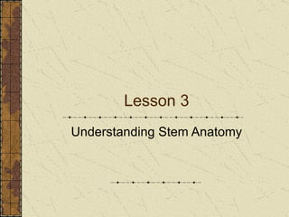 The four functions of stems are to support leaves, move water and minerals throughout the plant, produce food through photosynthesis, and store food. The tip of the external stem is called the terminal bud, which contains the apical meristem tissue responsible for increasing stem length. Leaves and buds attach to stems at nodes, and when they fall off they leave behind leaf scars. The three main internal tissues are xylem, which conducts water and minerals upward; phloem, which conducts food downward; and cambium, which increases stem thickness. Specialized stems include bulbs, corms, rhizomes, stolons, and tubers.
