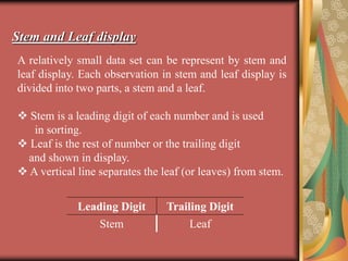 Stem and leaf displays provide a way to visually represent relatively small data sets. Each data point is divided into a stem, which is a leading digit used for sorting, and a leaf, which is the trailing digit displayed after a vertical line. Stem and leaf displays show the actual data values, can be easily converted to frequency tables, and provide a useful overview of a data set's distribution. To create one, the data is sorted by stem, with leaves arranged to the right of each stem. Back-to-back stem and leaf displays allow two data sets to be compared side by side.