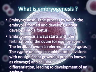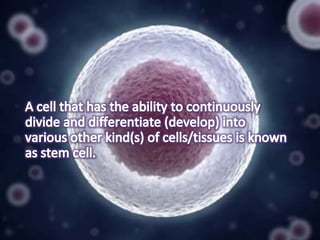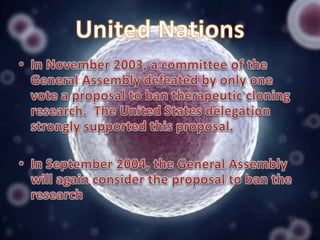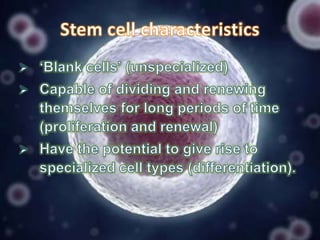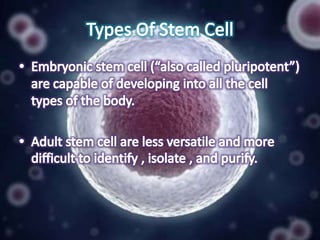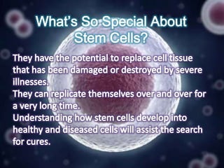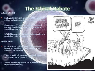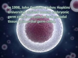 Stem cell research has progressed significantly since the 1960s when scientists first isolated stem cells. In 1998, James Thomson derived the first human embryonic stem cell lines from the inner cell mass of human embryos. There are two main sources of embryonic stem cells: in vitro fertilization embryos and somatic cell nuclear transfer. Embryonic stem cell research holds promise for developing treatments for diseases like Parkinson's, Alzheimer's, and cancer. However, it also faces ethical debates because it involves the destruction of embryos. Both advantages and disadvantages of this research must be considered regarding its future.