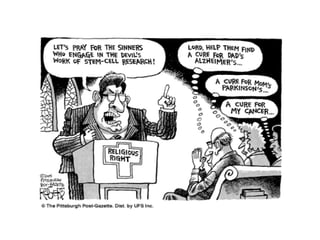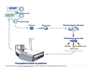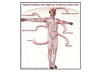 This document discusses stem cells and their clinical implications. It begins by defining stem cells and outlining their ability to self-renew and differentiate. The document then reviews the history of stem cell research, types of stem cells based on potential, sources of stem cells, the steps of stem cell therapy, and potential applications of stem cells. It also debates the arguments for and against stem cell research.