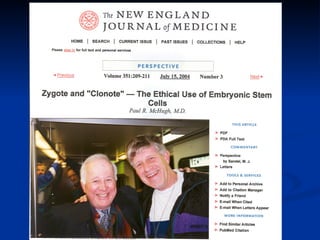 This document summarizes the ethical and scientific issues surrounding the use of human stem cells. It discusses the different types of stem cells, the history and potential uses of stem cell research, and perspectives from various religious traditions. Key ethical principles in bioethics like beneficence, non-maleficence, autonomy and justice are also examined in the context of stem cell research.