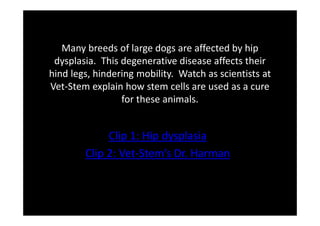 The document discusses how stem cells are being used to treat hip dysplasia in large dogs and explains the types of stem cells, including totipotent, pluripotent, multipotent, and unipotent. It highlights the differentiation process of stem cells and their potential to cure various diseases and injuries, including spinal cord injuries. Questions about stem cell properties and their applications in humans are also presented.