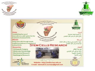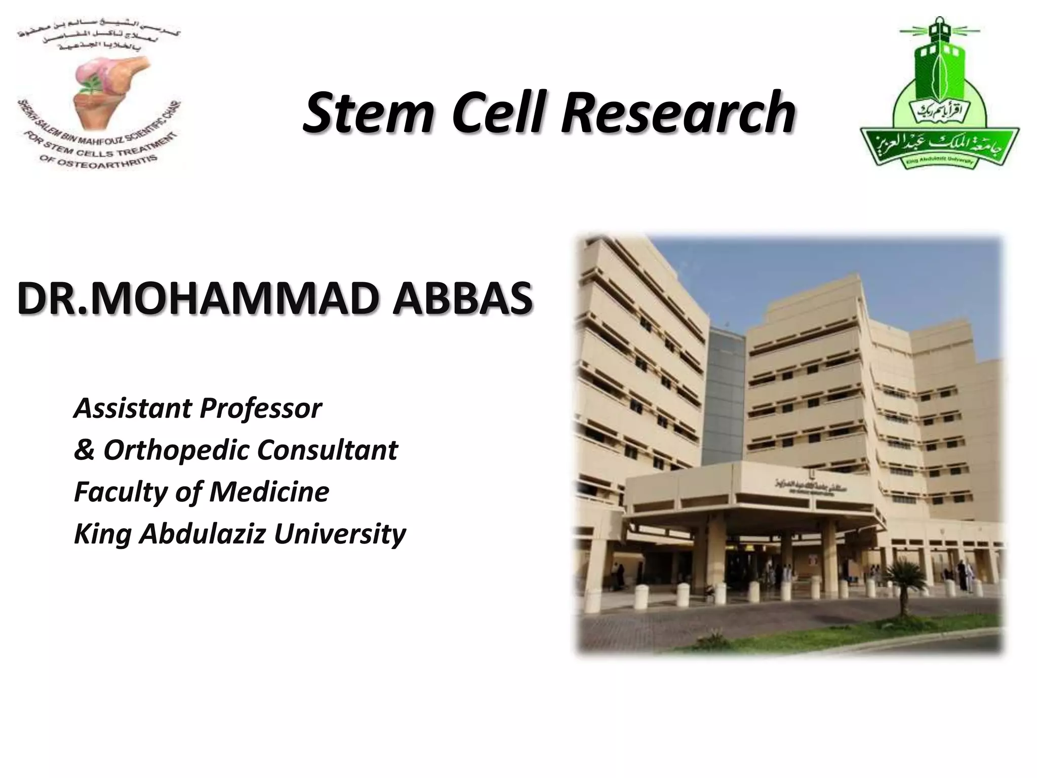 This document summarizes stem cell research projects conducted by Dr. Mohammad Abbas at King Abdulaziz University. It outlines 5 research groups: 1) Isolation and characterization of bone marrow mesenchymal stem cells from osteoarthritis patients, 2) Effect of heat shock on bone marrow MSCs from OA patients, 3) Evaluation of ex-vivo cartilage regeneration using MSCs from OA patients, 4) Impact of MSCs impregnated with cartilage paste on repairing cartilage defects in rabbits, and 5) Impact of a hyaluronic acid scaffold impregnated with MSCs and cartilage paste on surgically induced arthritis in rabbits. Additional research includes studies on the effects of catecholamines and NSAIDs