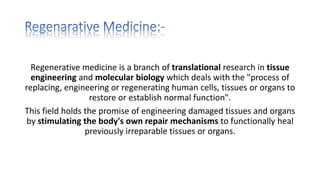 This document discusses regenerative medicine and its promise to replace or regenerate human cells, tissues, and organs to restore normal function. It deals with stimulating the body's natural repair mechanisms to heal tissues and organs that were previously irreparable. The document then lists topics related to regenerative medicine including evolution, developmental biology, stem cells, induced pluripotent stem cells, transcription factors, challenges in clinical trials, and recent achievements.