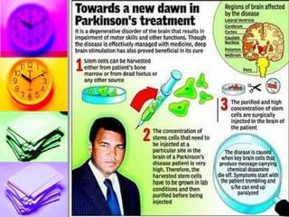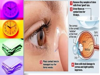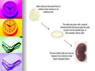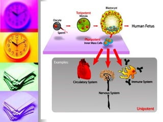 Stem cells are undifferentiated cells that can differentiate into specialized cells and can self-renew. There are several types of stem cells including embryonic, adult, and fetal stem cells. Embryonic stem cells are the most versatile but also raise ethical issues, while adult stem cells are more limited in their differentiation potential. Stem cell therapy works by stem cells differentiating into the type of cells needed to repair damaged tissue when transplanted into the body. Current applications of stem cell therapy include treating diseases like cancer, diabetes, and Parkinson's disease.