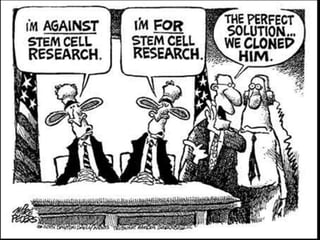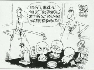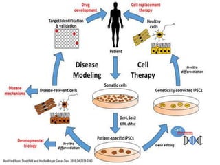 Stem cells are undifferentiated cells that can differentiate into specialized cell types and can self-renew to produce more stem cells. There are three main types of stem cells: embryonic stem cells which are pluripotent, adult stem cells which reside in adult tissues, and induced pluripotent stem cells which are generated from adult cells. Stem cells are currently being researched for their potential uses in cell therapies, drug development and testing, and understanding human development. However, there are also disadvantages such as tumor formation and ethical issues regarding the use of embryonic stem cells. The future of stem cell research remains promising but still has many unanswered questions.