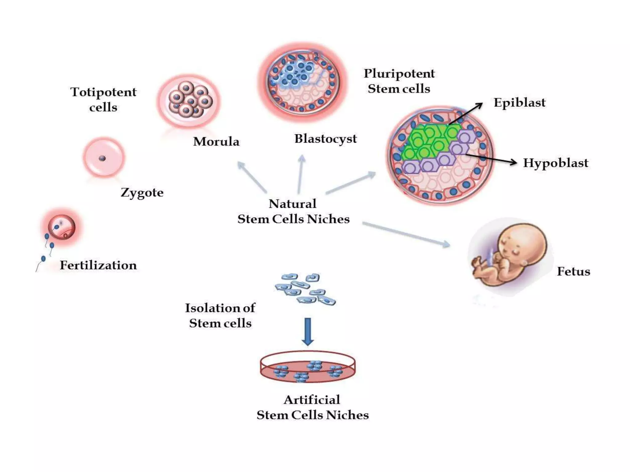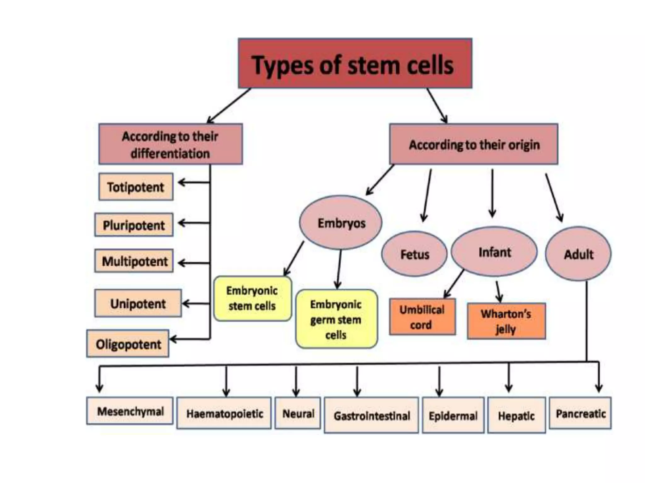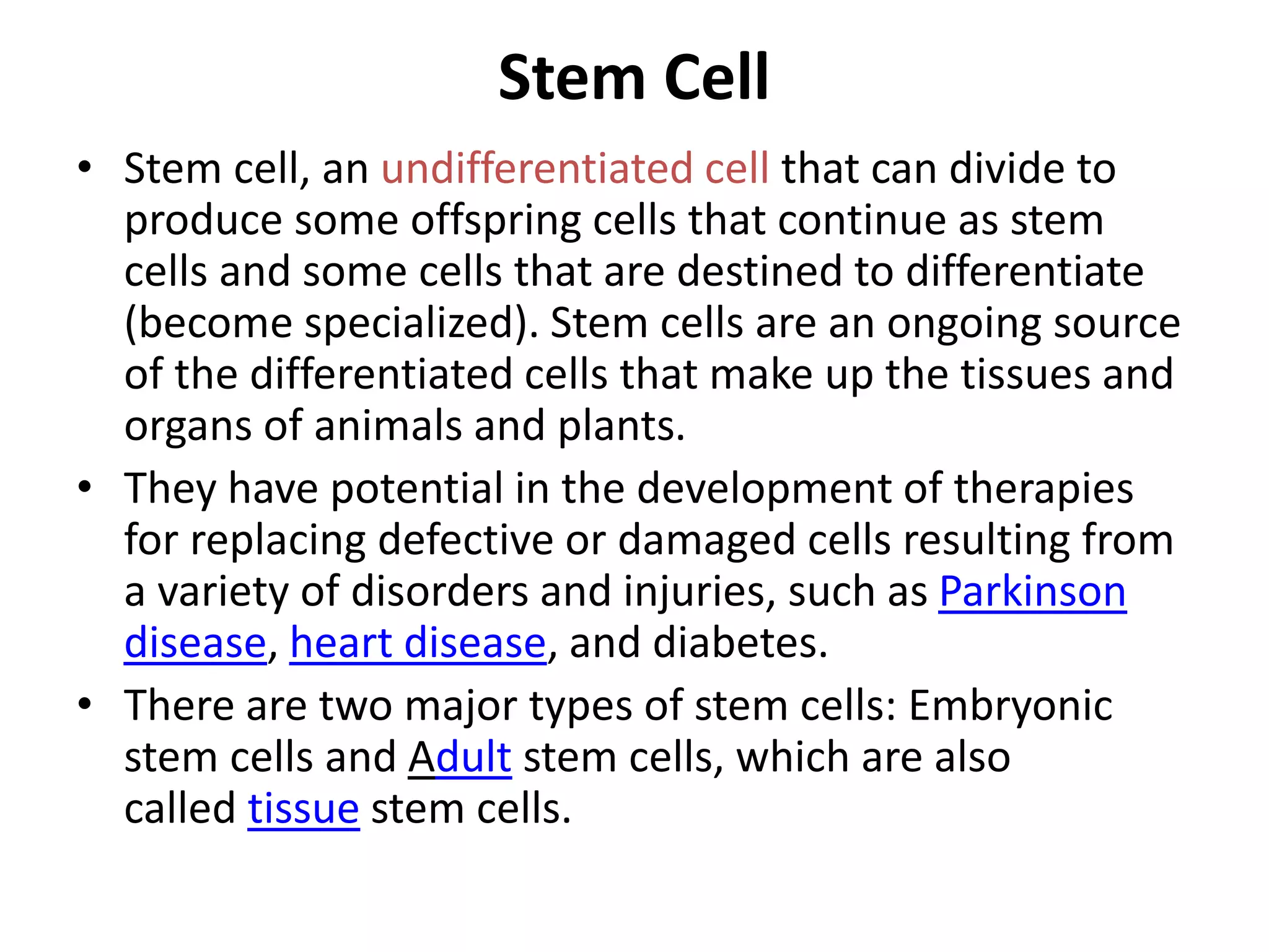 Stem cells can be categorized into two major types: embryonic stem cells and adult stem cells. Embryonic stem cells are derived from the inner cell mass of a blastocyst and are pluripotent, while adult stem cells are found in adult tissues and have more limited potential. Stem cells show promise for developing therapies for diseases like Parkinson's disease and diabetes by replacing damaged or defective cells. Stem cell therapies are being tested for conditions such as autoimmune diseases, heart disease, brain injuries, and multiple sclerosis.