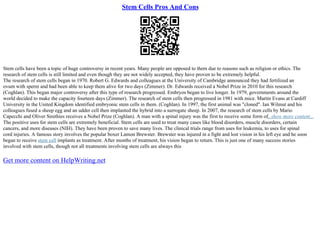 Stem cell research offers promising medical applications but also raises ethical concerns. Potential pros include developing treatments for conditions like Parkinson's and Alzheimer's. However, obtaining embryonic stem cells requires destroying embryos, which some believe ends a human life. Additionally, stem cell therapies are still experimental and may have safety issues. Overall, the debate centers on balancing medical progress with ethical considerations around human dignity and life.