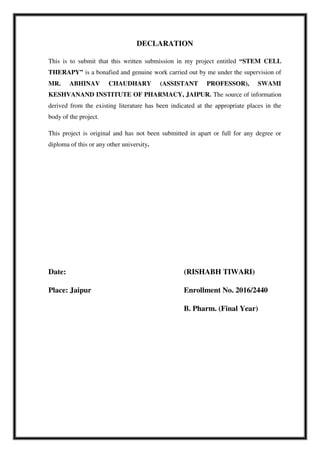 This document provides an overview of a student project report on stem cell therapy. It includes sections on the introduction, advantages, disadvantages, types of stem cells, sources, isolation and culture, stem cell division, treatment, medical uses, applications to various diseases and conditions. The report was submitted by a pharmacy student, Rishabh Tiwari, to Rajasthan University of Health Sciences, Jaipur, India under the supervision of a faculty member, to fulfill the requirements of a Bachelor of Pharmacy degree.