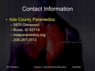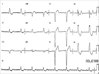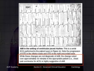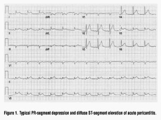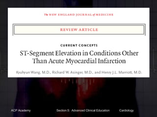 This document provides information on STEMI, NSTEMI, and STEMI mimics for paramedics. It discusses the importance of accurate 12-lead ECG interpretation for identifying STEMIs to reduce door-to-balloon times and improve outcomes. It outlines criteria for calling a "Code STEMI" to activate the cardiac catheterization lab as well as situations where a "Medical Stat" or routine transport would be more appropriate based on the 12-lead findings. The goal is to minimize false STEMI activations while still rapidly identifying true STEMIs.