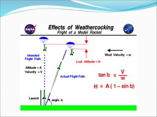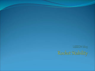 This document discusses rocket stability. It explains that rockets can become unstable if their center of gravity is behind their center of pressure, creating a destabilizing force. The center of gravity and center of pressure can be adjusted to achieve stability by changing fin size/shape, adding/removing weight from the nose cone, and adjusting airframe length. For optimal stability, the center of pressure should be at least one body tube diameter in front of the center of gravity, known as one caliber stability.