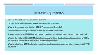 This document discusses STEM education and initiatives in India. It begins by outlining research questions on STEM education and then discusses teaching STEM through an integrated approach focusing on science, technology, engineering and mathematics. It outlines government initiatives to promote STEM like the National Education Policy 2020 and Atal Tinkering Labs. It also discusses building STEM readiness in institutions, corporate initiatives to support STEM and self-initiatives students can take to learn STEM.