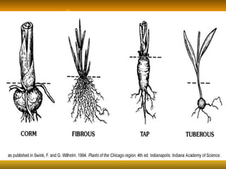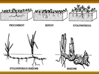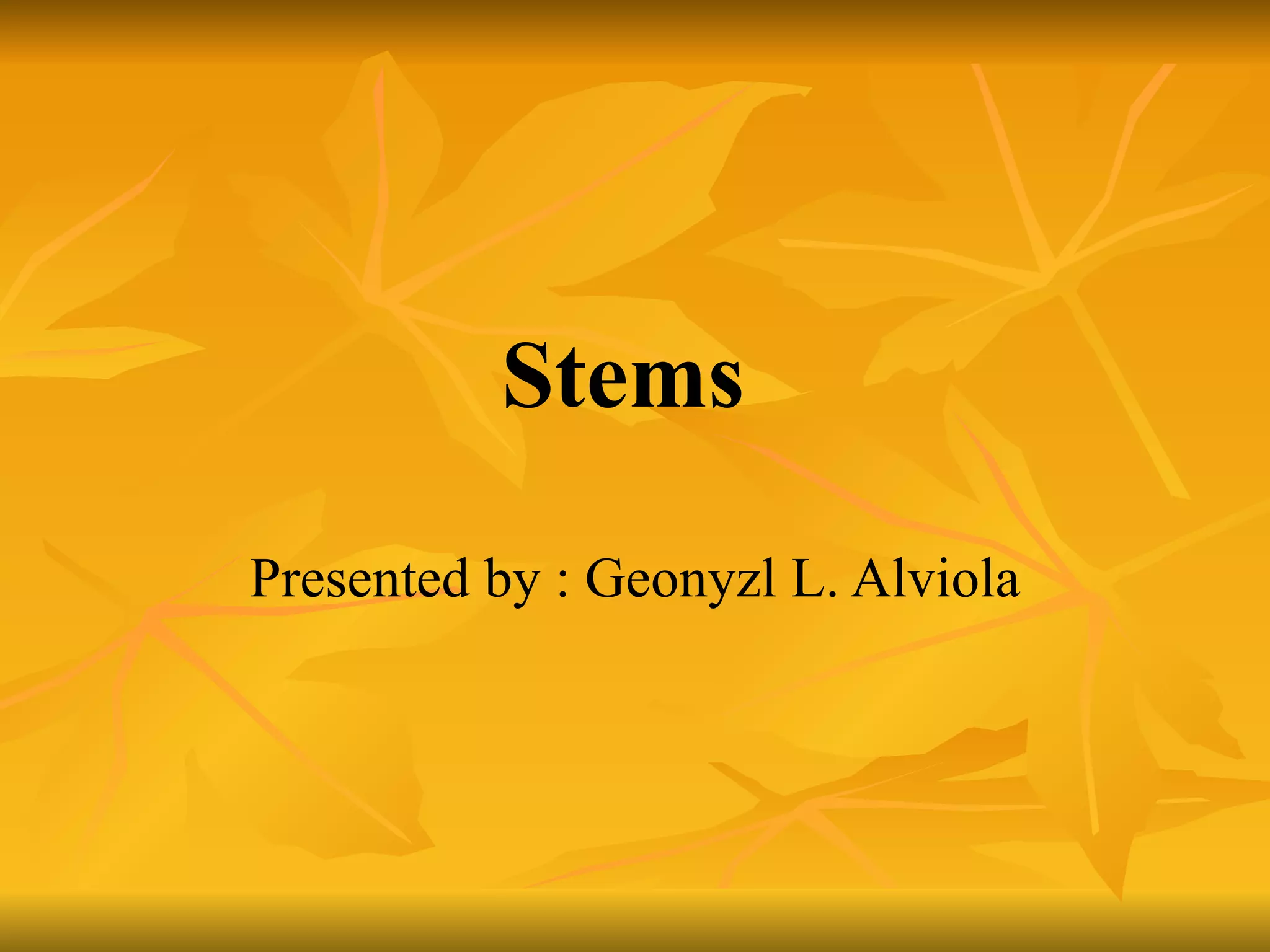 Stems serve both supportive and conductive functions for plants. They develop from the epicotyl of seeds and connect other plant organs like leaves, flowers, and fruit. Stems can be modified for storage, protection, or propagation. Some common modified stems include rootstocks, bulbs, corms, caudices, rhizomes, stolons, cladodes, and tubers. Rootstocks like bulbs, corms, and caudices remain underground during harsh conditions. Rhizomes are horizontal underground stems while tubers are thick underground storage stems lacking scales. Stolons are stems that propagate horizontally just below the soil surface.