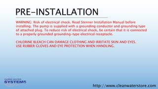 The document is a comprehensive installation and start-up guide for the Stenner pump chlorinator, emphasizing electrical safety, proper chemical handling, and the importance of maintaining chlorine levels in water treatment. It outlines steps to determine flow rates, chlorine demand, required contact tank size, and solution strengths, providing formulas for accurate dosing and equipment settings. Users are encouraged to refer to additional resources and contact support for further assistance.