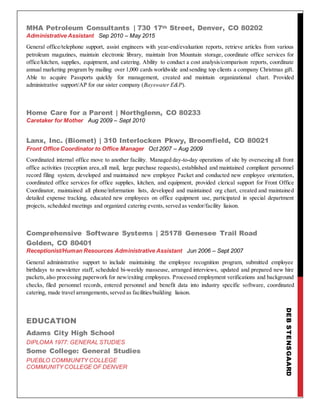Debra D. Stensgaard is an experienced administrative assistant currently working at Express Scripts, where she provides extensive support to leadership and manages various site activities. Her past roles include administrative positions at MHA Petroleum Consultants and Lanx, Inc., where she coordinated office operations and facilitated onboarding processes. Stensgaard possesses strong communication skills and is detail-oriented, with a commitment to achieving goals through hard work and integrity.