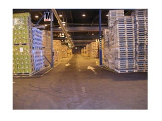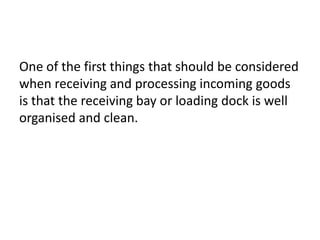 The document discusses procedures for maintaining a clean and organized receiving bay. It is important to keep the receiving bay clean and organized to make the receiving process easier, prevent accidents, and potential theft. Proper procedures should be followed such as ensuring all goods and equipment have a designated storage place, walkways remain clear, goods are promptly processed, and housekeeping is regularly performed. Appropriate security measures like access restrictions and cameras also help prevent theft in the receiving bay. New technologies like RFID, conveyor belts, and robotic systems are increasingly used to further organize the receiving process and reduce risks.