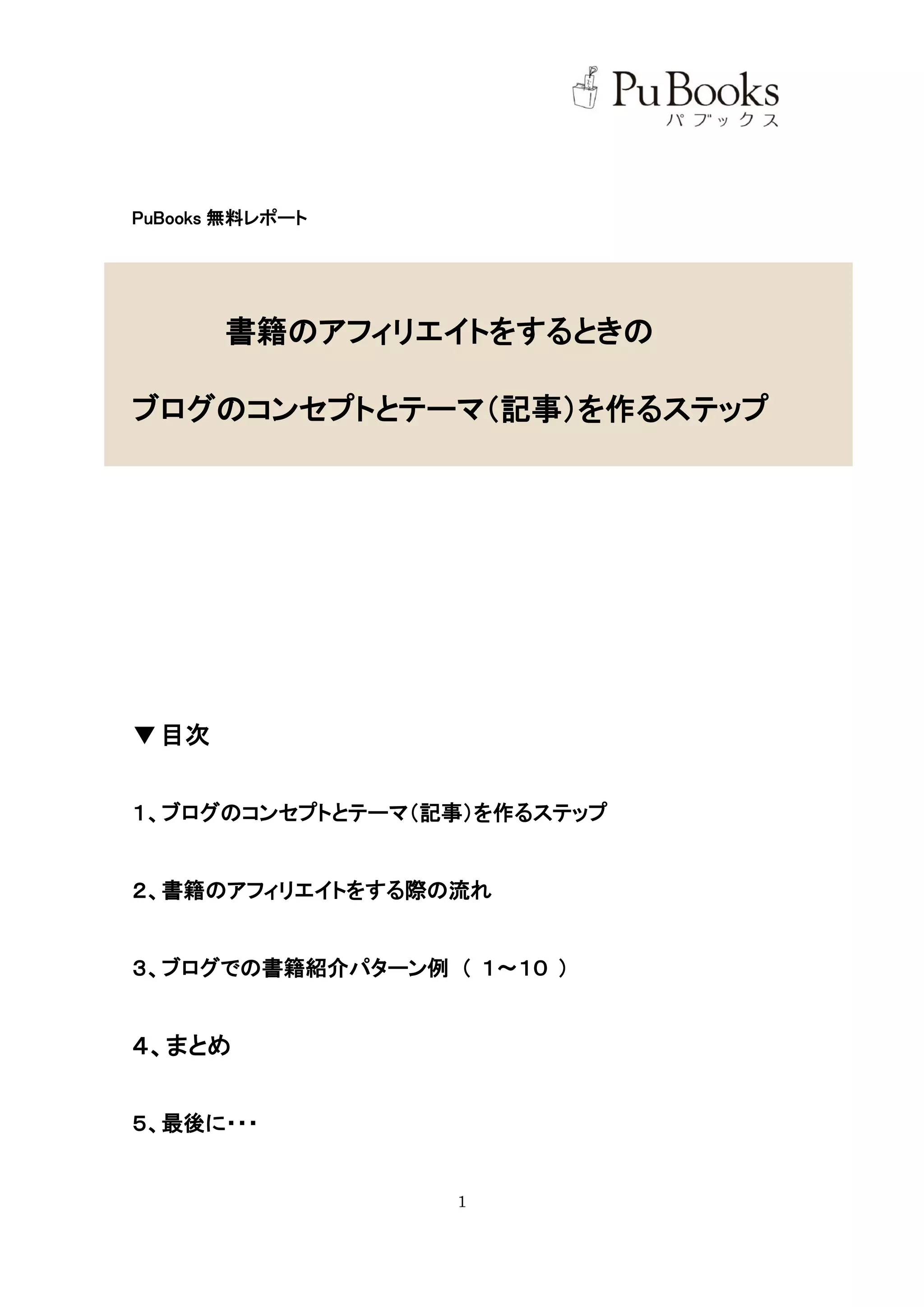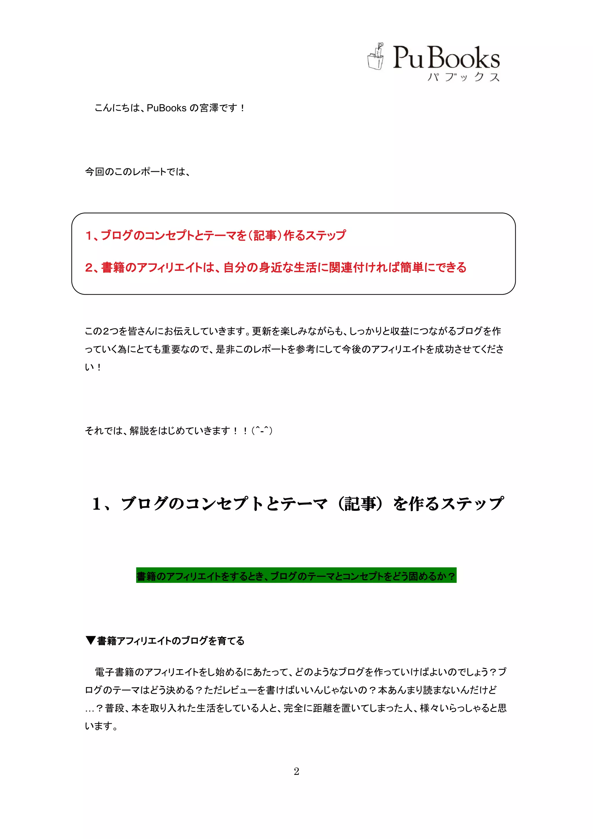 こんにちは、PuBooks の宮澤です! 今回のこのレポートでは、 1、ブログのコンセプトとテーマを(記事)作るステップ 2、書籍のアフィリエイトは、自分の身近な生活に関連付ければ簡単にできる この2つを皆さんにお伝えしていきます。更新を楽しみながらも、しっかりと収益につながるブログを作 っていく為にとても重要なので、是非このレポートを参考にして今後のアフィリエイトを成功させてくださ い! それでは、解説をはじめていきます!!(^-^) 1、ブログのコンセプトとテーマ(記事)を作るステップ