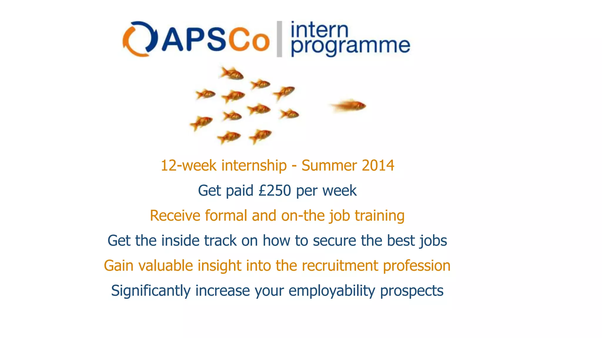 This 12-week summer internship provides training in recruitment skills and industry insight. Interns will be paid £250 per week, receive formal and on-the-job training from APSCo members, and gain experience in sourcing candidates and clients. The internship increases employability by teaching core recruitment skills like relationship building and helping secure the best jobs.
