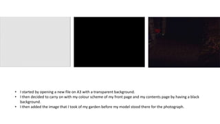 This document provides step-by-step instructions for creating a double page spread in InDesign. It describes adding images and text elements like page numbers, names, quotes and an article with questions and responses. Key steps include adding a light tint to images, outlining elements with shadows, and varying text size and bolding to draw attention to important quotes. Positioning of elements follows conventions like page numbers on the bottom and credits on the top. Text is laid out in two columns with consistent formatting and fonts throughout the spread.