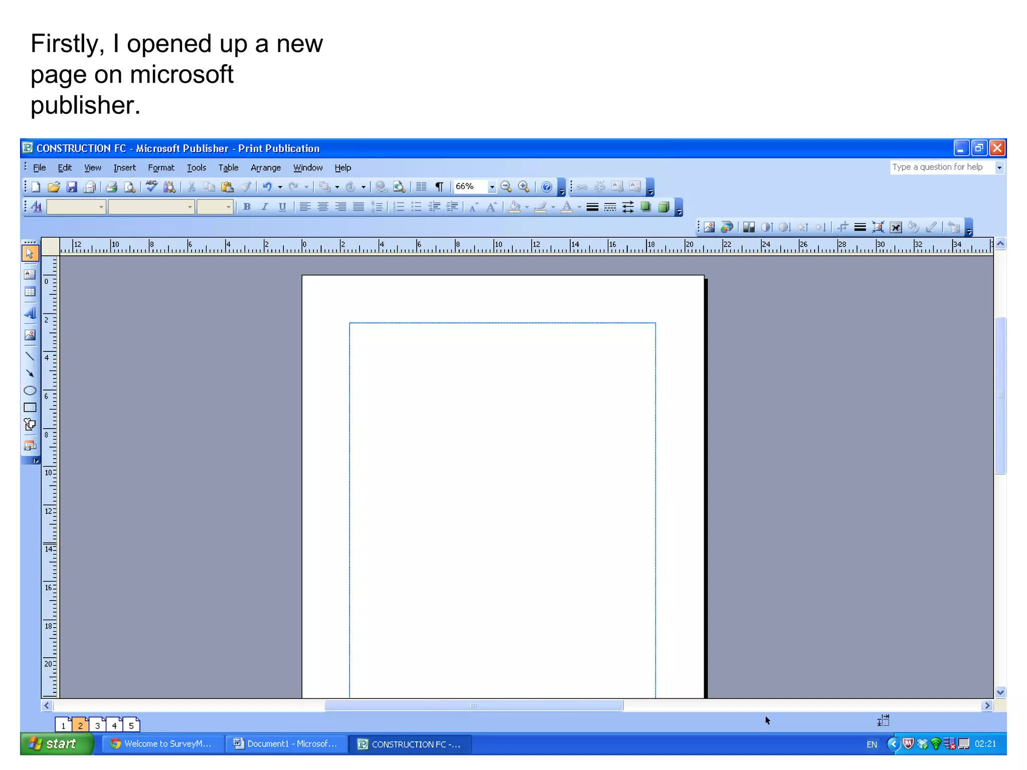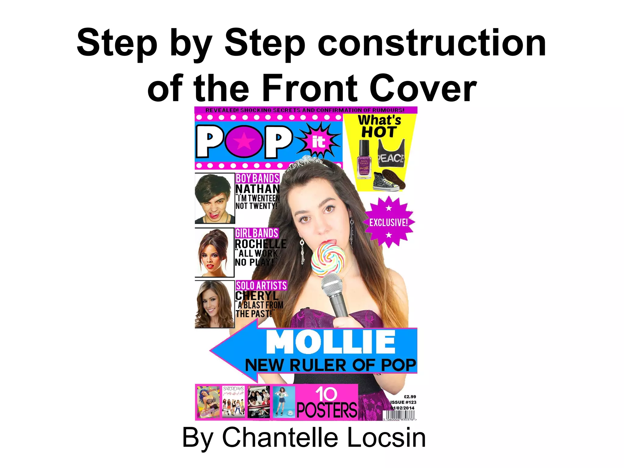 Chantelle describes the step-by-step process for constructing a magazine front cover in Microsoft Publisher. First, she opened a new page and added the masthead borders and layout. Next, she placed the main image to overlap the masthead and act as a background layer. Then, she added shaped backgrounds in the magazine's color scheme and positioned images and text based on her draft. Finally, she included additional details like the barcode with pricing and issue information.