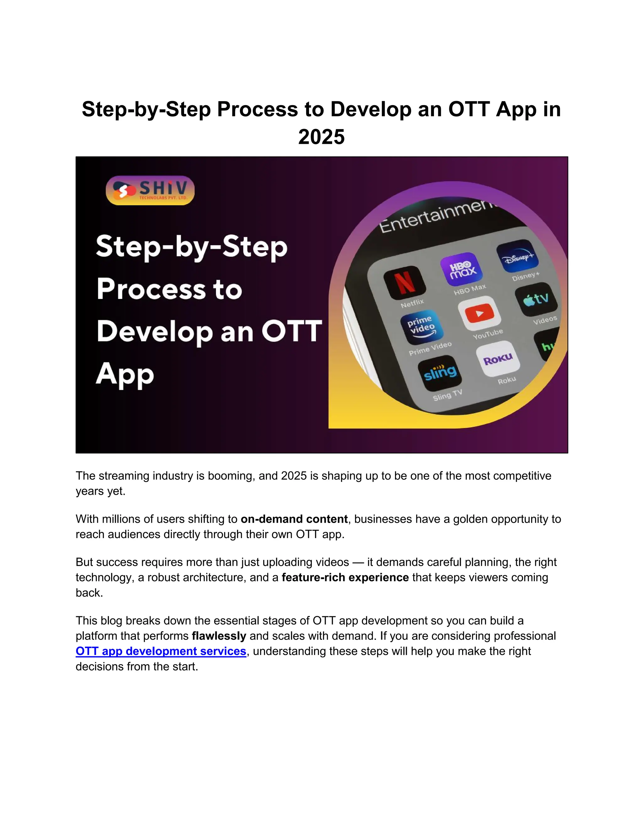 Learn from our blog on the full process of building an OTT app. We have covered each stage from planning and design to development, testing, and launch. We also have discussed selecting the right tech stack, creating user-friendly interfaces, and integrating essential features like streaming, payments, and analytics. This blog shares insights on security, scalability, and user engagement. We can create a high-performing OTT app that meets audience expectations and business goals. For more information, read our blog!