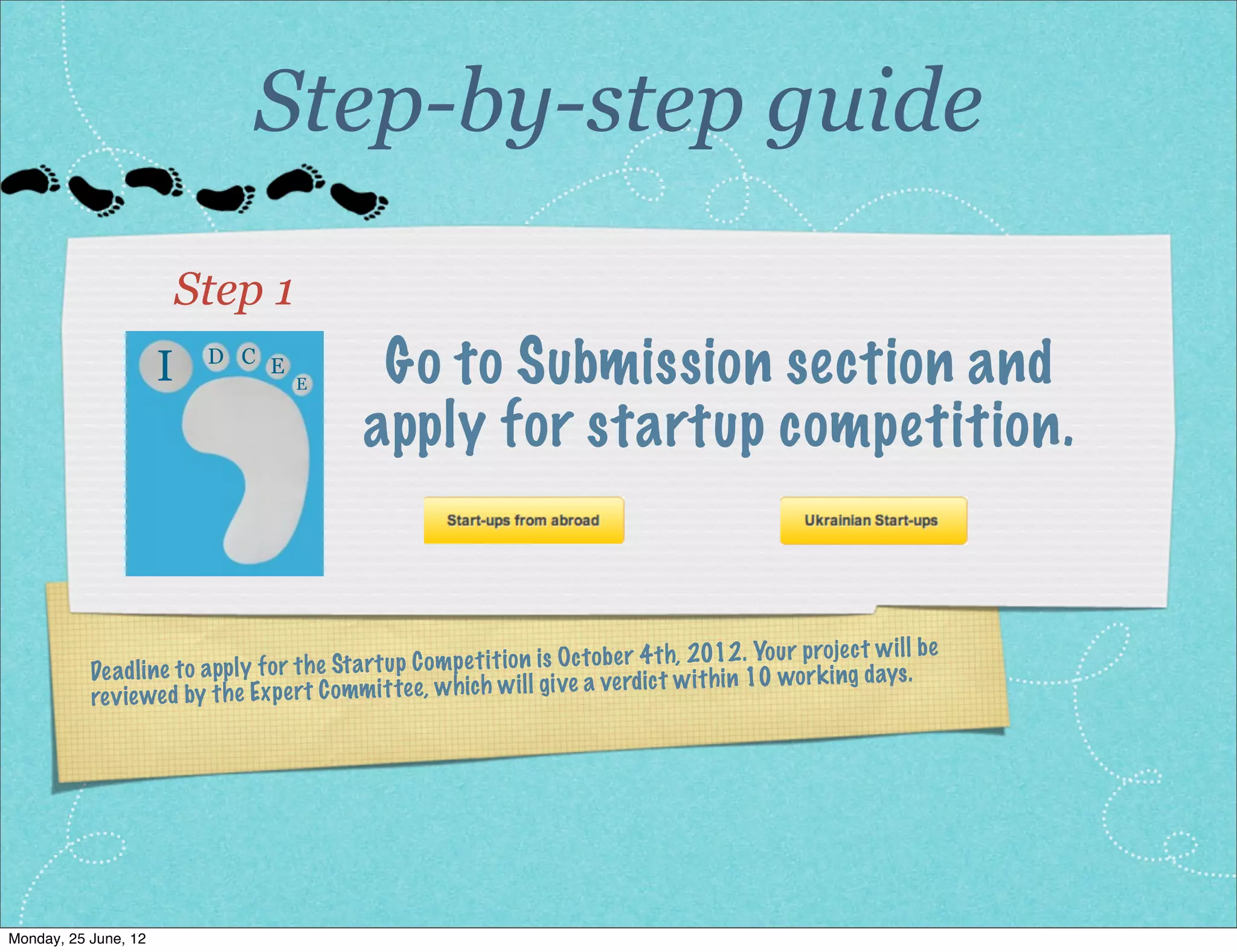 This 9-step guide summarizes the process for applying to participate in the Startup Competition at the IDCEE 2012 conference: