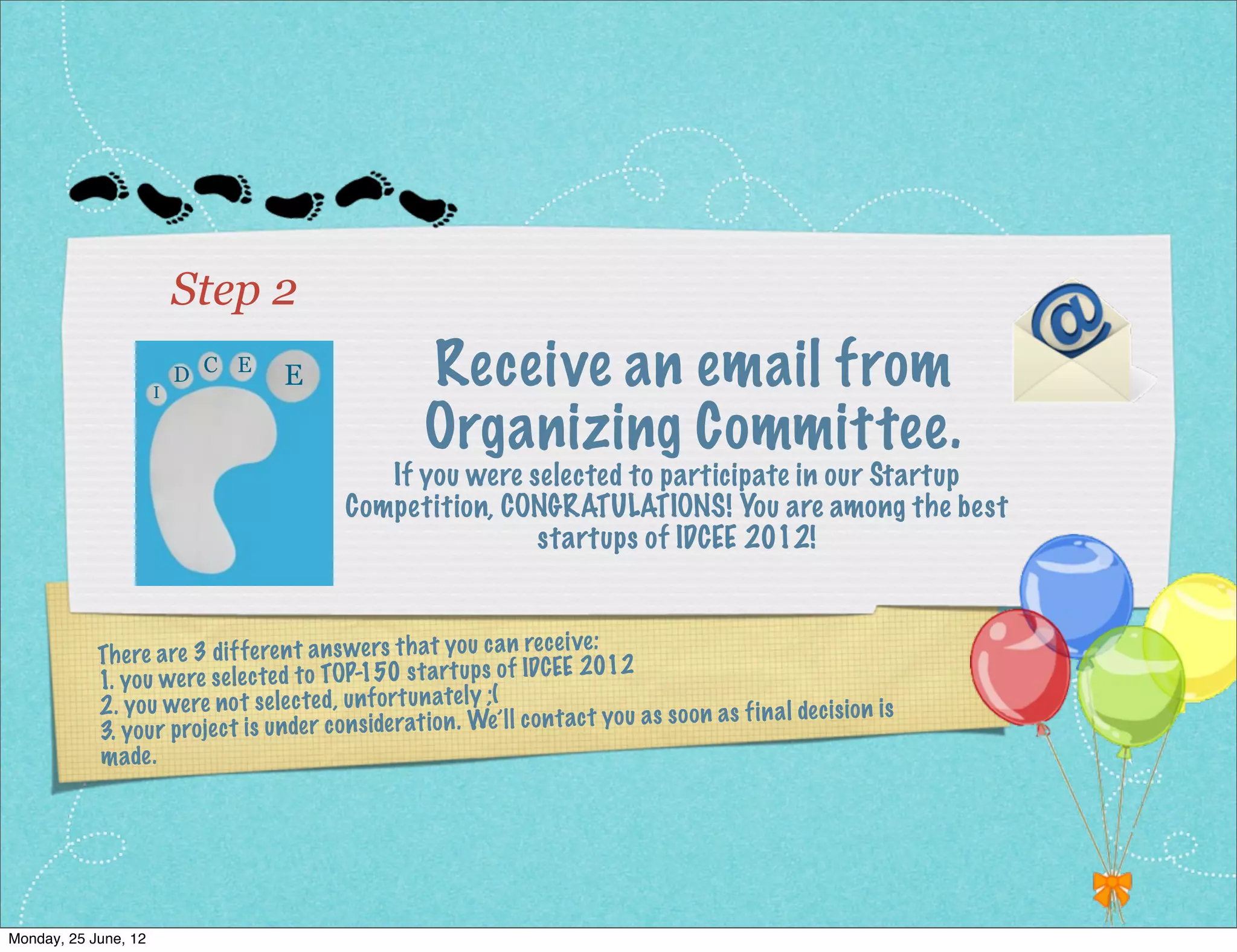 2. Receive an email by July 2nd informing you if you made the top-150 startups, were not selected, or are still under consideration.