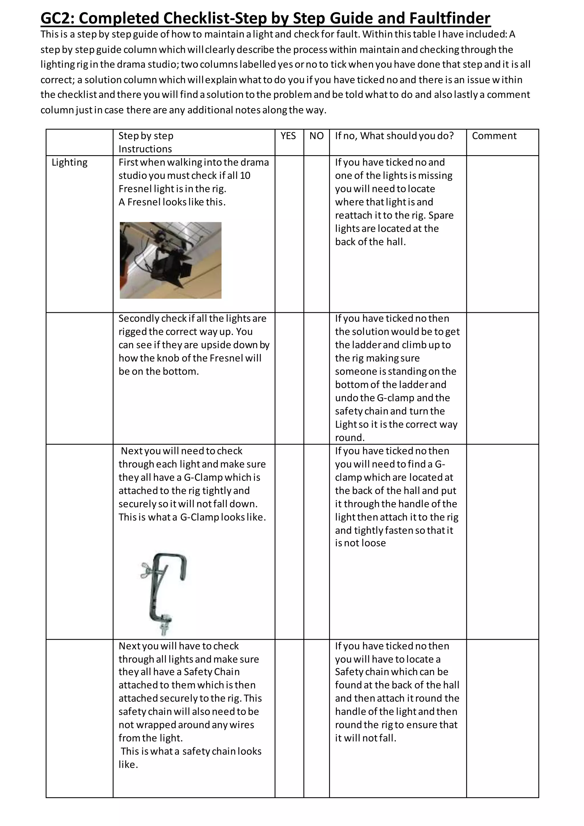 This document provides a step-by-step checklist for maintaining and checking the lighting rig in a drama studio. It includes instructions to check that all lights are attached properly to the rig, have safety features like clamps and chains securely fastened, and accessories like barn doors and gel frames are correctly installed. The checklist also includes steps to check the lighting desk, dimmers, and electrical connections are functioning properly. Potential issues are outlined along with solutions.