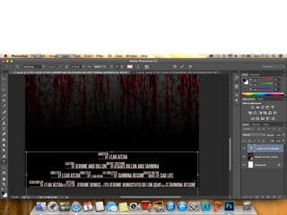 The document describes the process of creating a horror movie poster. The creator searched for bloody backgrounds online for inspiration. They chose an image with cracked walls and pouring blood. They then blurred an image of Freddy holding a hammer to obscure his identity while keeping the weapon visible. Text was added including the title "MOLLY" and credits with a staircase effect. Production companies were listed below and "COMING SOON" was added at the bottom in a dark maroon font.