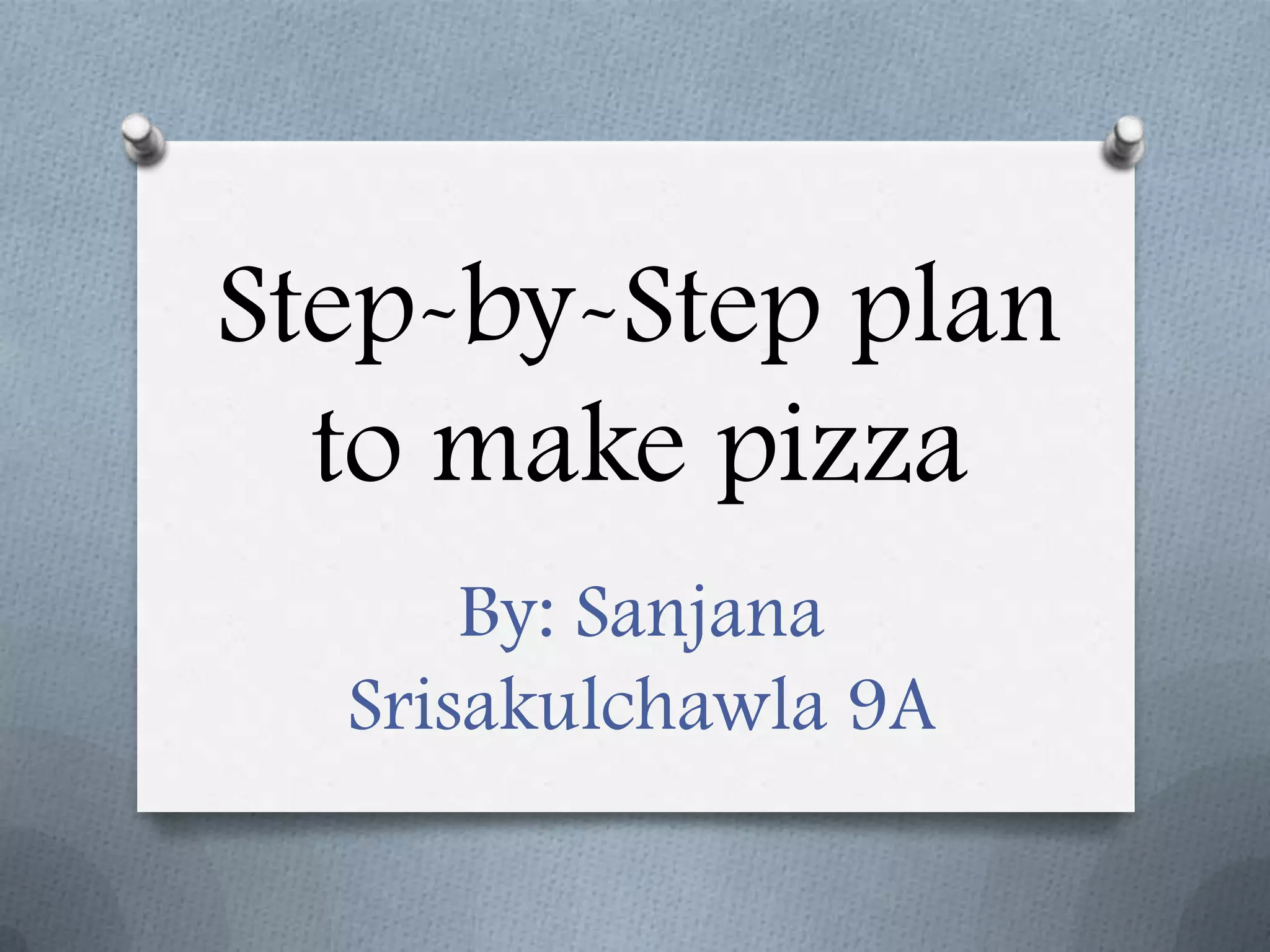 This document provides step-by-step instructions for making pizza from scratch. It lists the necessary ingredients which include flour, yeast, salt, sugar, olive oil and water. It then outlines each step of the process from mixing the dough and letting it rise, to dividing, stretching, topping and baking the pizza. The steps are accompanied by detailed instructions and tips for properly kneading, shaping and baking the homemade pizza.