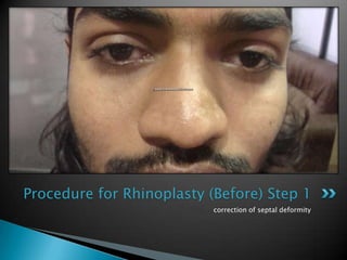 The document outlines the 9 step procedure for rhinoplasty, which includes correcting any septal deformities, elevating the skin flap to expose the internal nasal framework of cartilage and bone, performing osteotomies to correct bony deformities, and making any necessary incisions. The goal is to reshape the nose by modifying the bone structure and soft tissues.
