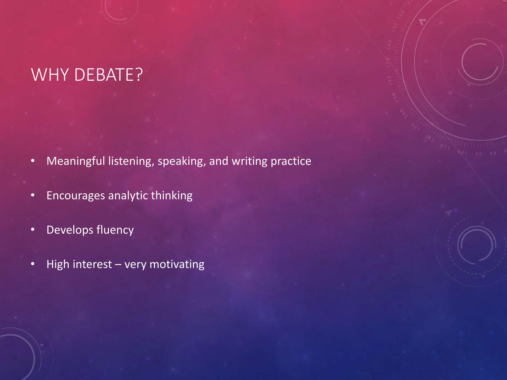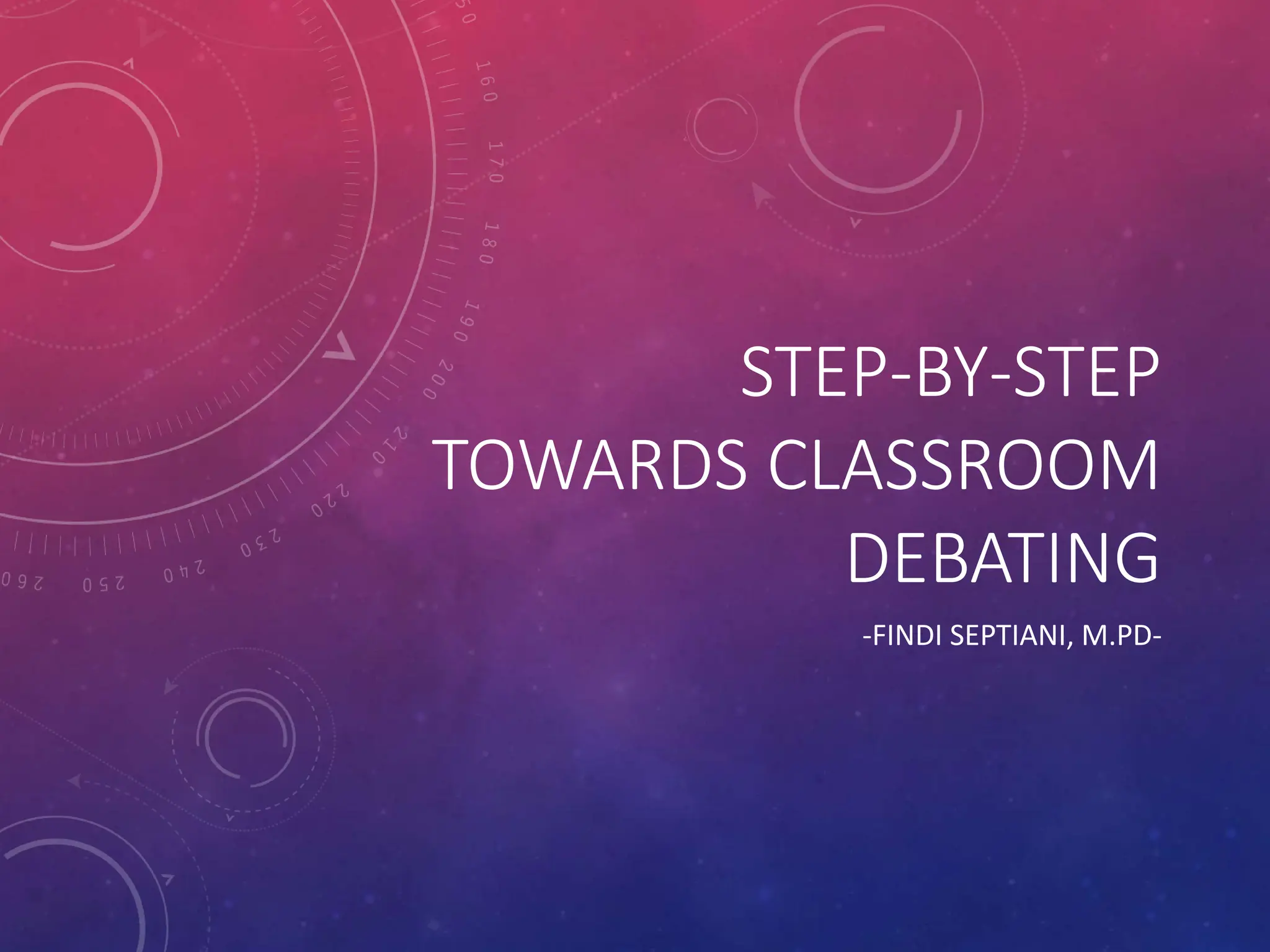 This document provides step-by-step instructions for teaching classroom debating. It begins by outlining the benefits of debating, such as developing critical thinking and public speaking skills. It then defines a debate as a formal discussion where participants argue opposing sides of an issue. The document explains how to structure classroom debates, including topics, roles, and techniques like rebuttals. It emphasizes organizing speeches clearly around matter (arguments and evidence), method (structure and logic), and manner (delivery). The goal is to encourage civil discussion and increase students' confidence in speaking English.