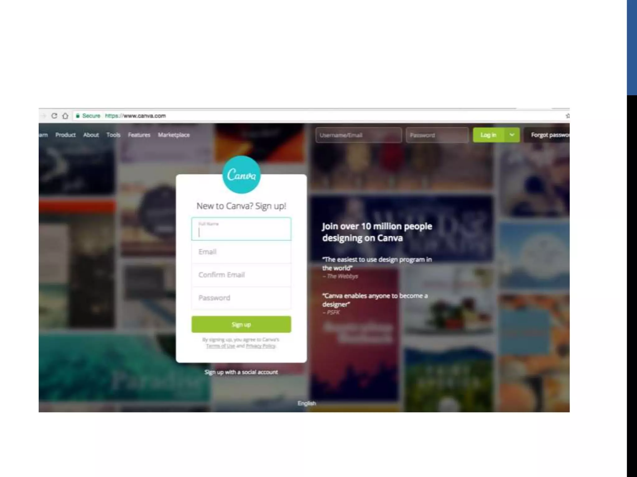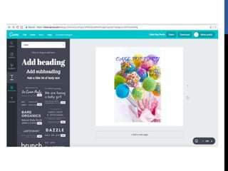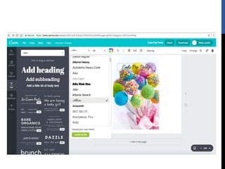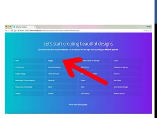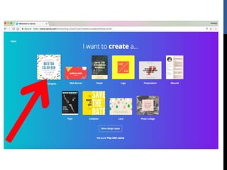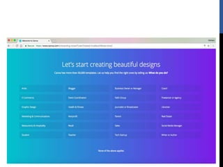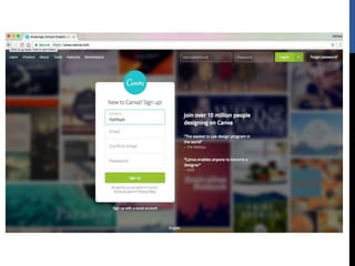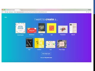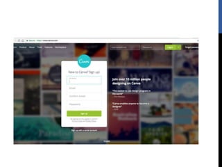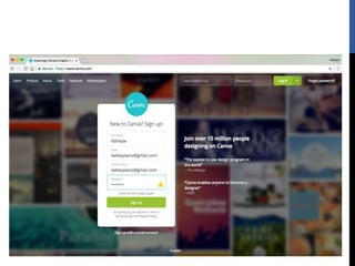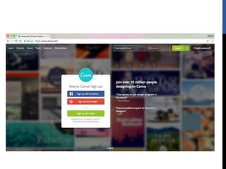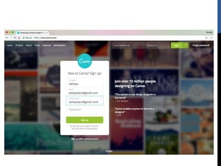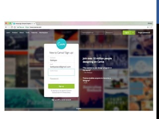 The document provides step-by-step instructions for creating designs using the online graphic design platform Canva. It outlines the sign up process and describes how to choose templates, add images and text, customize colors and fonts, and share or download completed designs for use on social media or other platforms.