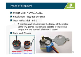 This document discusses stepper motors, including their types, resolutions, gear ratios, coils, phases, and drive methods. It provides details on a specific 28BYJ-48 5V unipolar stepper motor, including its specifications. It explains half-step sequencing and how stepper motor movement is controlled by pulse signals. Code examples are given for controlling a stepper motor with a Raspberry Pi. The document contrasts unipolar and bipolar stepper motors and their drive methods.