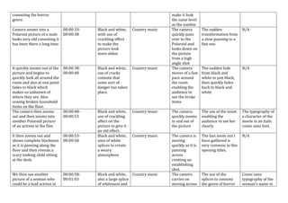 The opening titles of the film Silent Hill uses a series of fast-paced shots with black and white cinematography, flickering lights, and zooming cameras to set an eerie and unsettling tone. Typography introducing the directors, producers and characters appears on screen in a gothic font style. Through a series of quick shots, the camera pans across a dirty and broken location, showing disturbing images on polaroids and newspapers of characters and stopping briefly on abnormal people and a trapped body. This establishes the horror genre and hints that the characters may be trapped in the mysterious and dangerous town of Silent Hill.