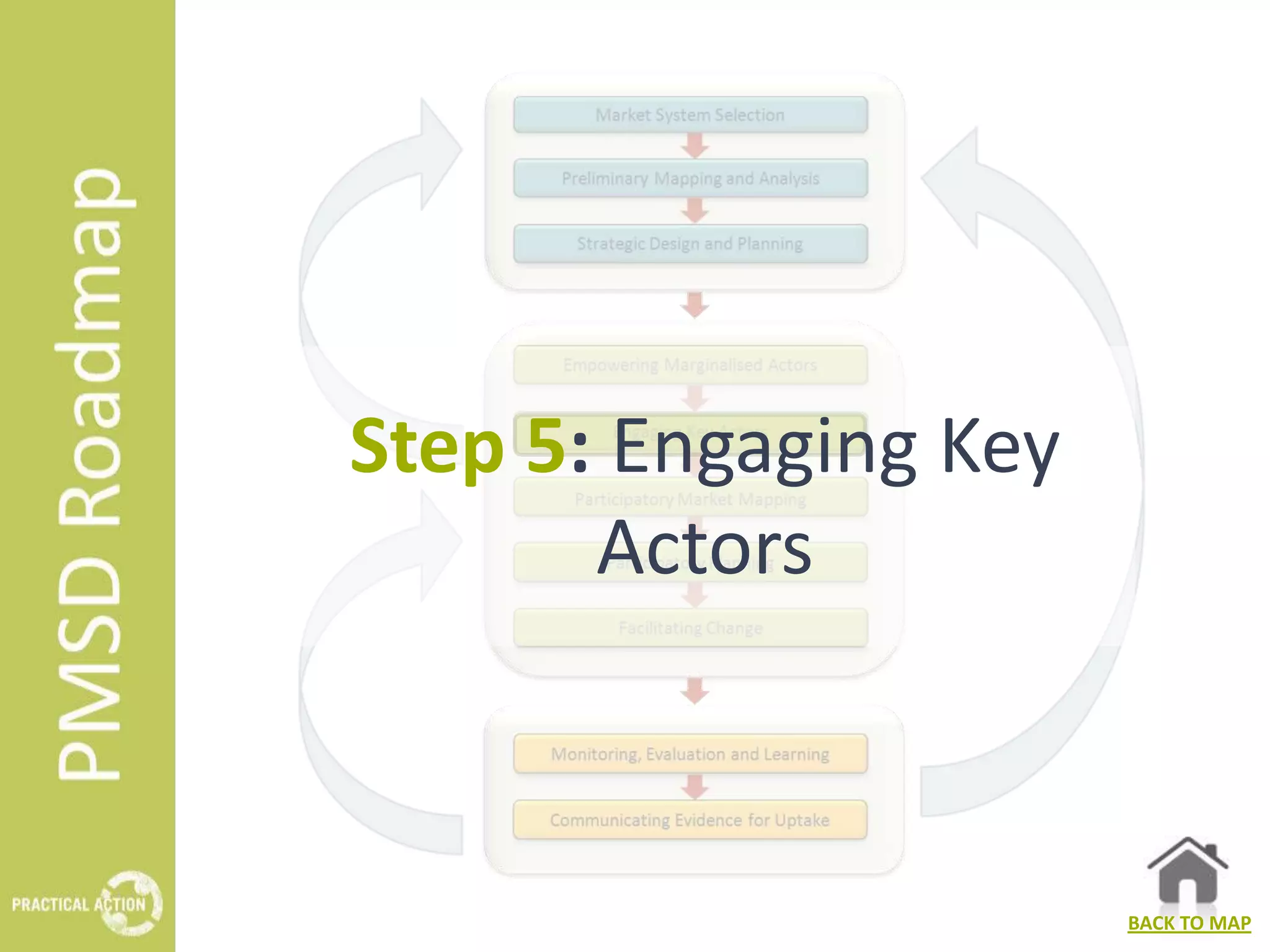 The document outlines the process of engaging key actors in the participatory market systems development (PMSD) process by identifying actors, understanding their incentives, and maintaining their interest. It provides guidelines, training materials, and case studies to help practitioners effectively engage these actors through strategic communication and relationship-building. Key tips include gathering insights on each actor's motivations and ensuring that inviting them feels beneficial to them.