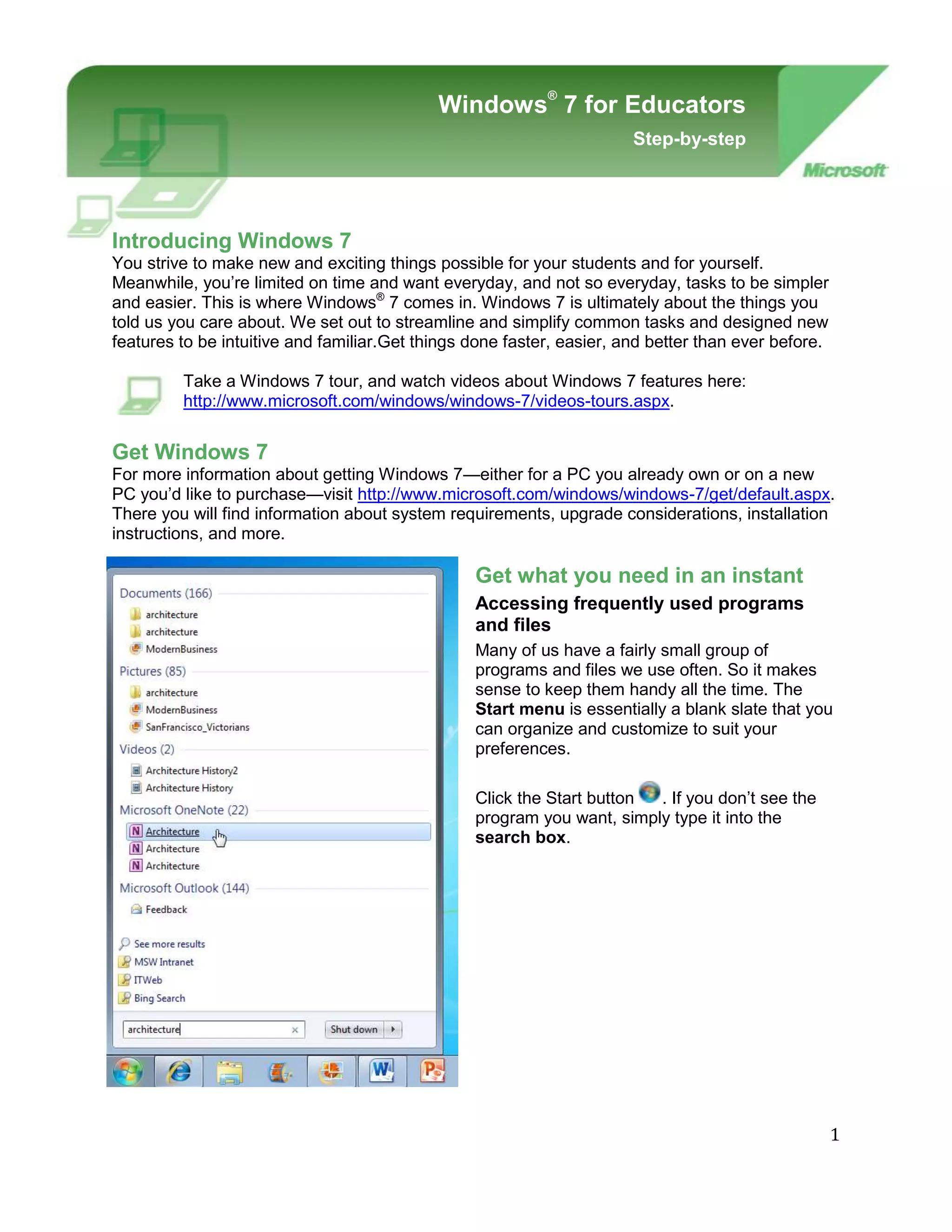 Windows 7 provides several features to help educators get things done faster and easier, including customizable Start menus and taskbars for quick access to frequently used programs and files, desktop gadgets for at-a-glance information, and tools like the Calculator, Snipping Tool, and Sticky Notes.