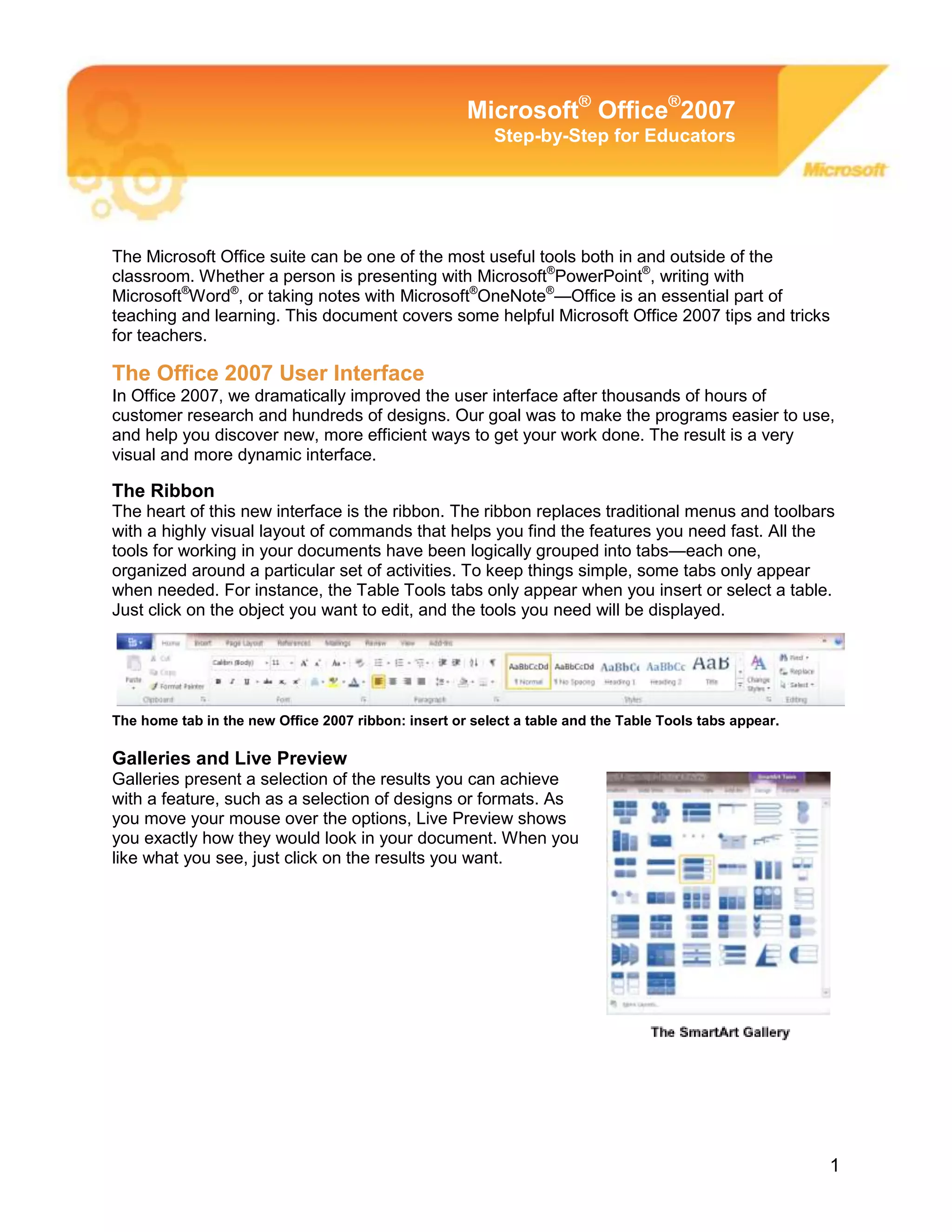 It describes the ribbon interface introduced in Office 2007 and how it organizes commands into tabs. Key features are highlighted for the Office applications OneNote, PowerPoint, and Word that are useful for teaching, such as creating shared notebooks in OneNote, adding animations and transitions in PowerPoint, and using track changes and comments for review in Word. The document concludes with information on additional Office 2007 resources for educators.
