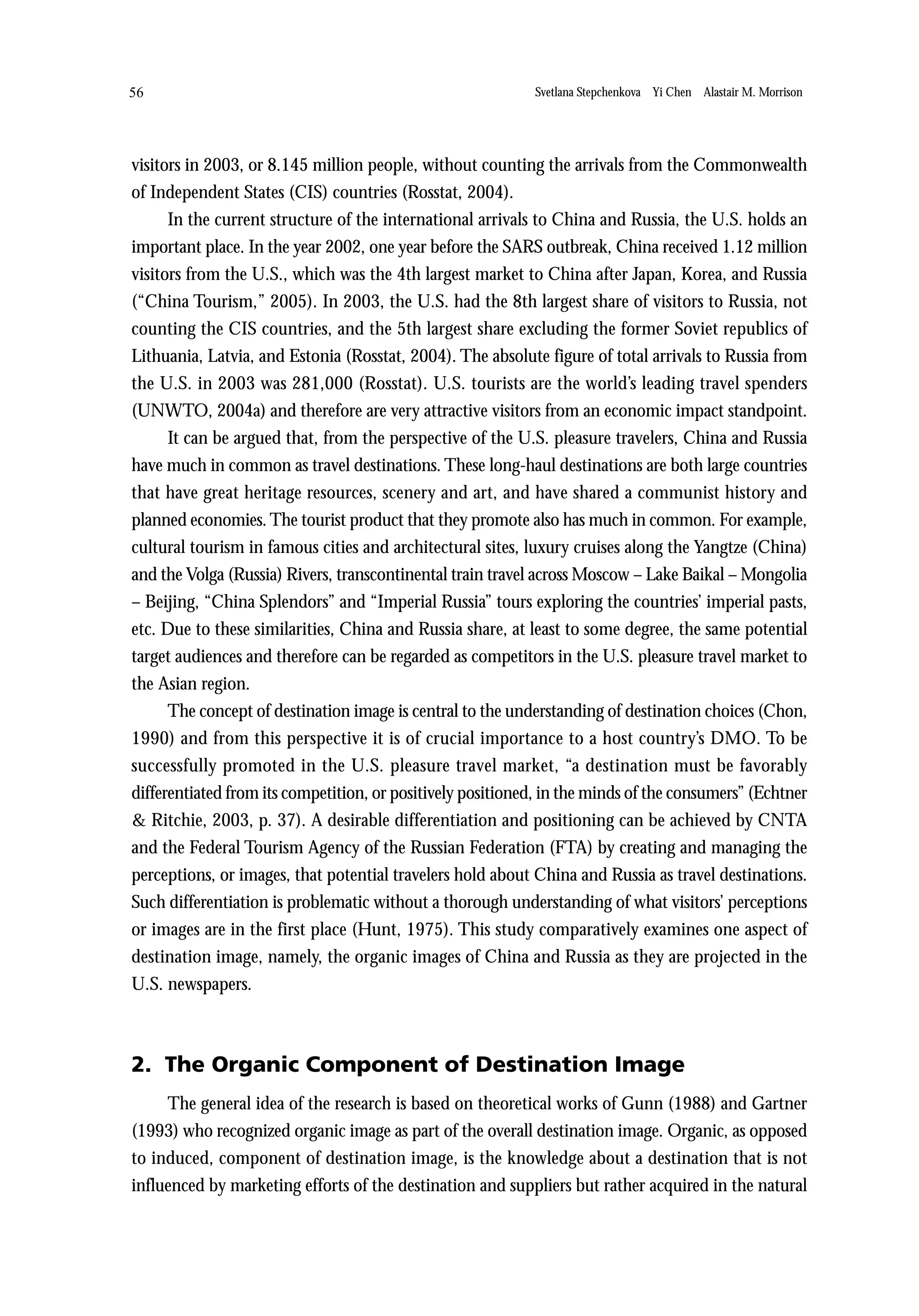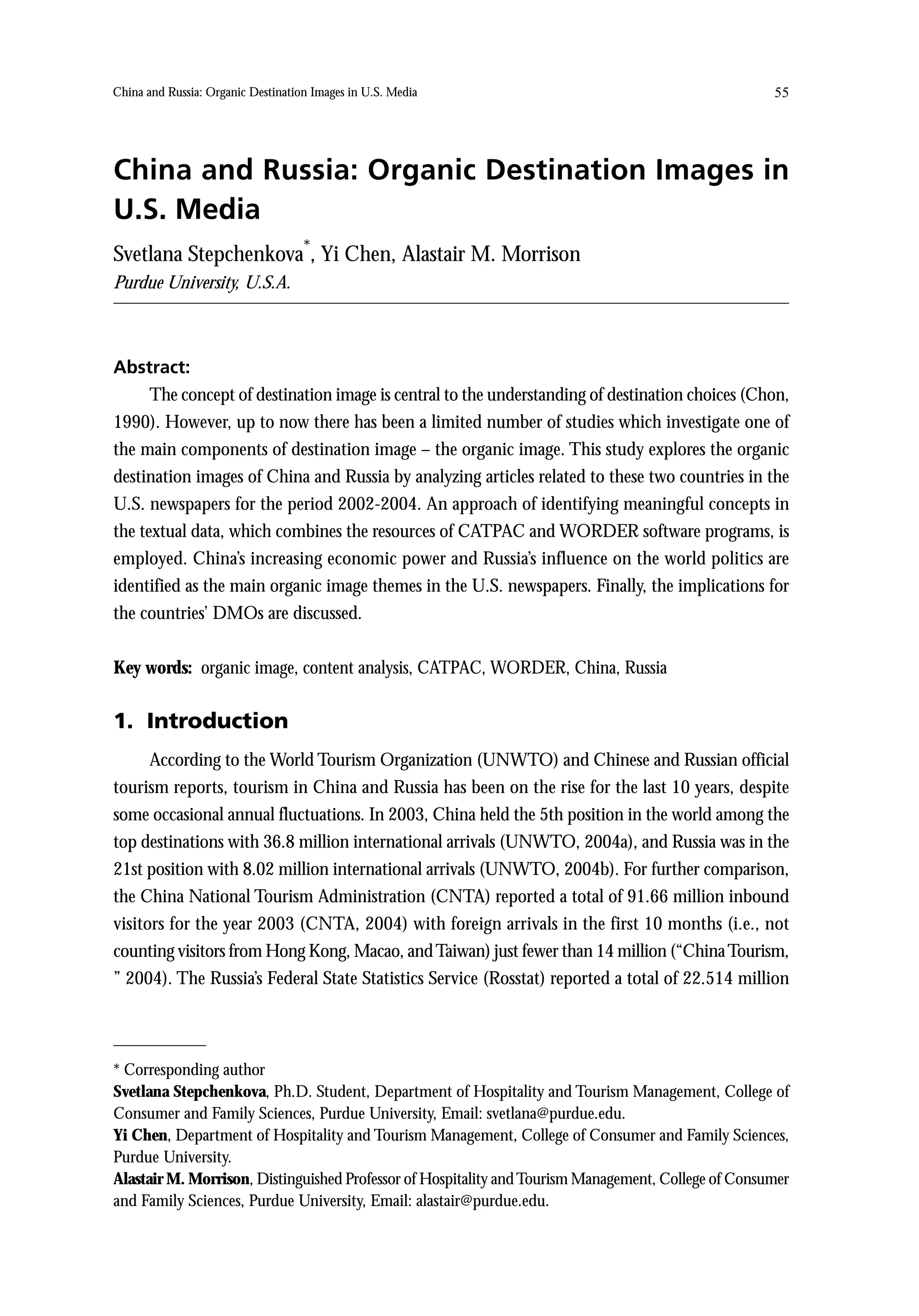 This document summarizes a study that analyzed articles about China and Russia in U.S. newspapers from 2002-2004 to understand their organic destination images. The study employed content analysis software to identify meaningful concepts in the textual data. The main findings were that China's increasing economic power and Russia's influence on world politics were the primary themes in the U.S. media's organic images of the two countries. The implications for China and Russia's destination marketing organizations are also briefly discussed.