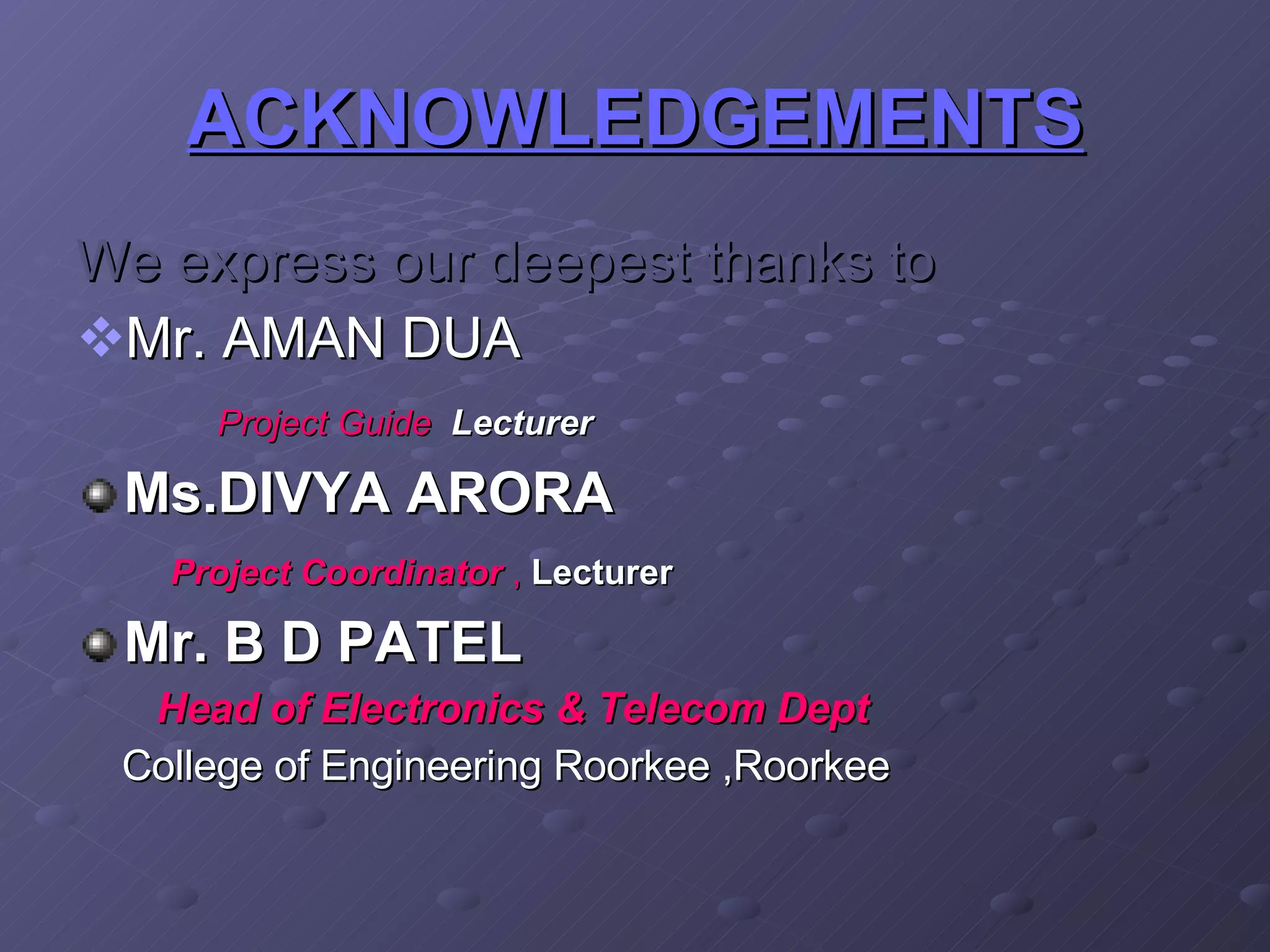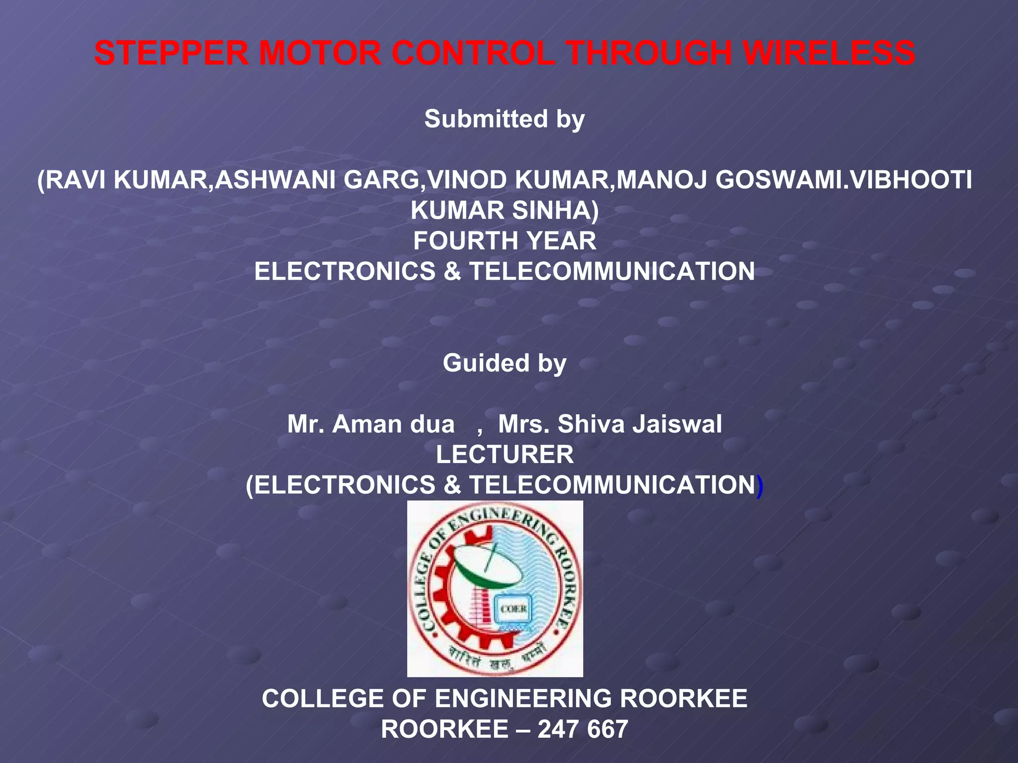 This document summarizes a student project to control a stepper motor through wireless transmission. The project uses a microcontroller to send step pulses to a driver circuit connected to a stepper motor. Commands can be sent from a computer serial port or wireless interface to control the motor speed displayed on an LCD screen. The system aims to provide precise digital control of the stepper motor position through simple wireless operation.