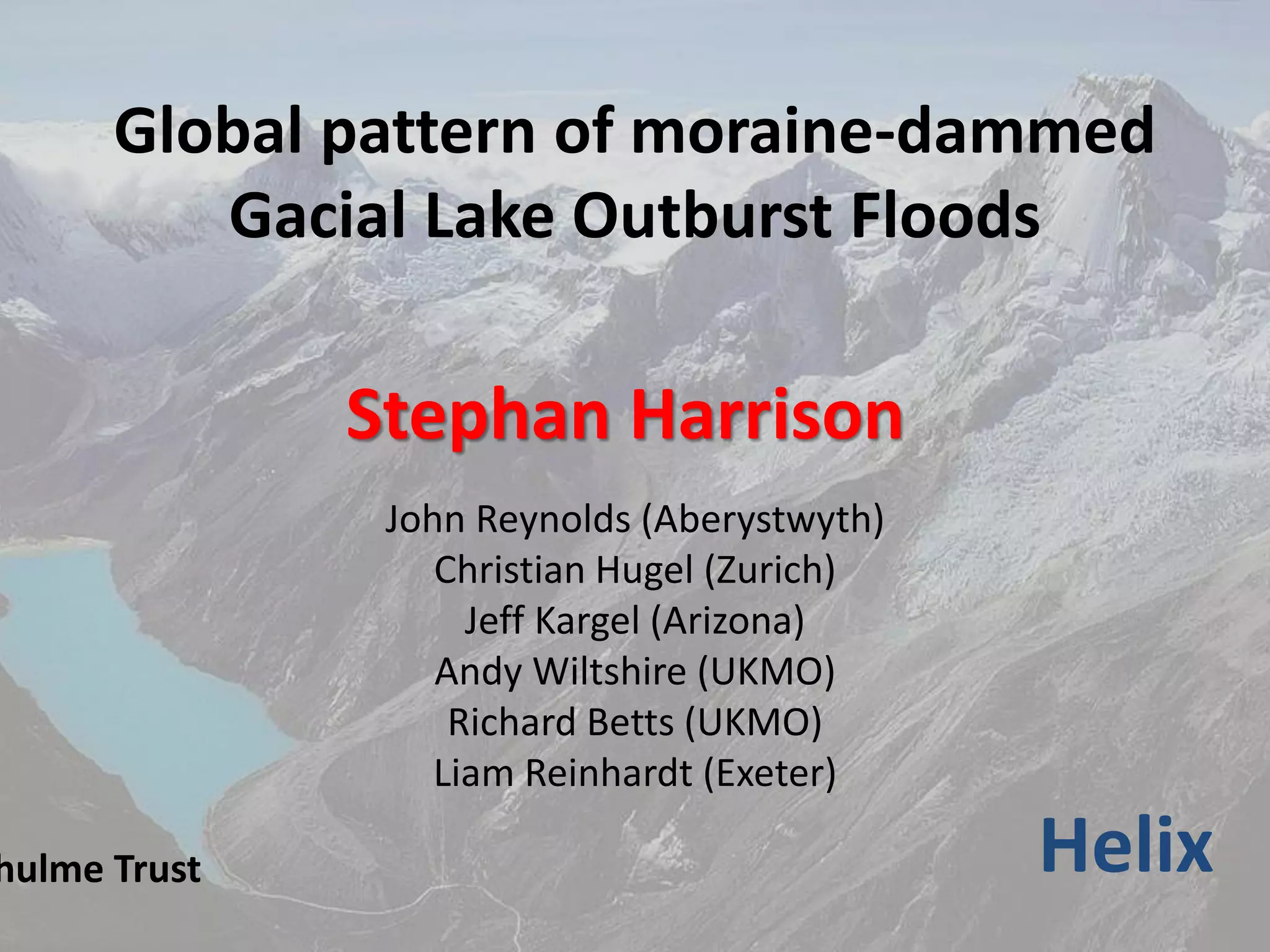 This document discusses global patterns of moraine-dammed glacial lake outburst floods (GLOFs) and the challenges of attributing them to climate change. It notes that while temperatures are rising in mountain regions worldwide, the recorded number of GLOFs has fallen with no clear trend in magnitude. Attributing GLOFs to anthropogenic global warming is difficult due to issues modeling small-scale mountain processes and a lack of complete global data on GLOF events over time. The development of improved models at appropriate scales and a more robust global GLOF inventory are needed to better understand the relationship between climate and these extreme geomorphic events.