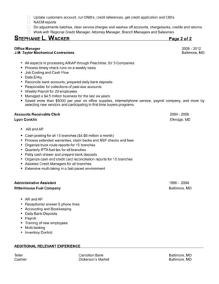 Stephanie Wacker has over 20 years of experience as an administrative assistant and office manager. She has a proven track record of managing accounting tasks like accounts receivable, accounts payable, payroll, and bookkeeping for multiple companies. Her skills include office administration, data entry, record keeping, customer service, and computer programs like Microsoft Office. She is seeking a new position where she can utilize her organizational abilities and experience handling a variety of administrative responsibilities.