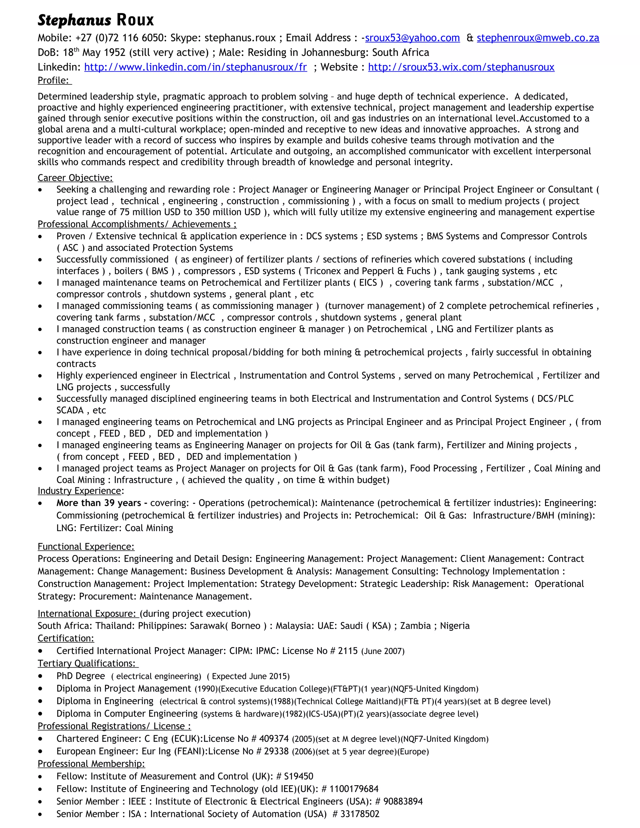 This document provides information on Stephanus Roux, including his contact details, career objective, professional experience, qualifications, and recent roles. It summarizes that he has over 39 years of experience in various engineering, project management, and operational roles in industries including petrochemicals, oil and gas, fertilizers, and mining. His most recent roles included project manager and engineering manager positions.