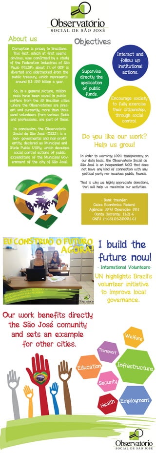 The document discusses the Observatorio Social de São José (OSSJ), a non-governmental organization in Brazil that works to promote transparency and social control of public spending. It states that corruption costs the Brazilian economy around 100 billion reals per year. OSSJ has volunteers monitoring spending in 80 cities, and aims to empower citizens to oversee the application of public funds and institutional actions. As an independent non-profit, it does not receive public funding and relies on donations.