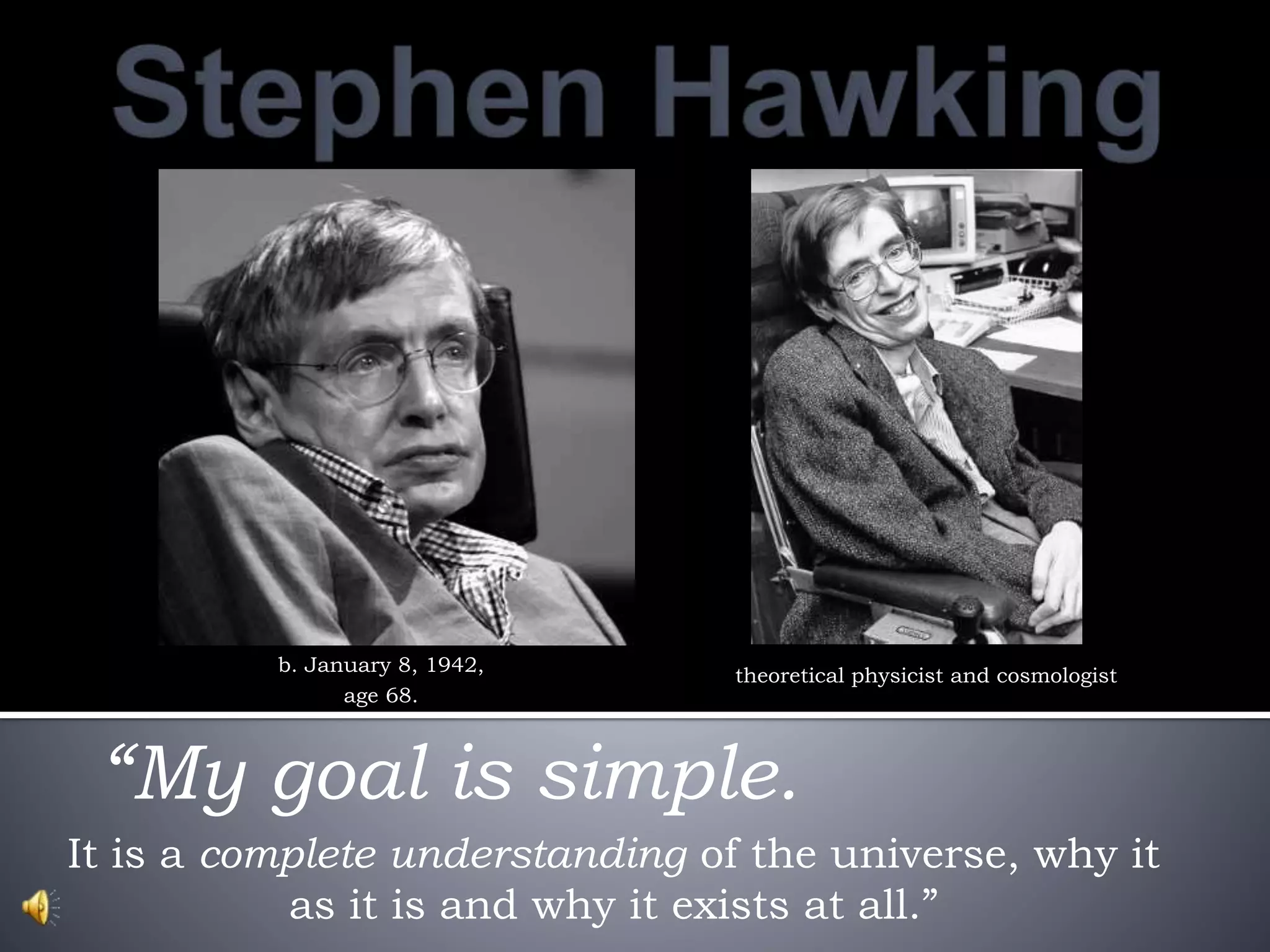 Stephen Hawking was a renowned theoretical physicist and cosmologist born in England in 1942. He studied physics and cosmology at Oxford and Cambridge universities. Hawking was diagnosed with ALS at age 21 but defied the odds to survive for over 50 years with the disease, which left him paralyzed. Despite his disability, he was able to continue his groundbreaking research on black holes and the origins of the universe. Some of his major contributions include developing the theory of Hawking radiation and showing how black holes can emit particles. He also helped develop links between gravity and quantum mechanics. Hawking authored several popular science books and was awarded numerous honors for his scientific achievements, including the Presidential Medal of Freedom.