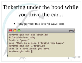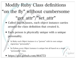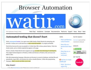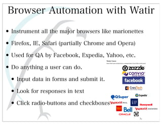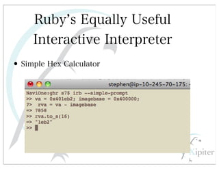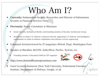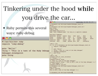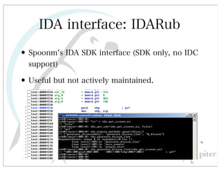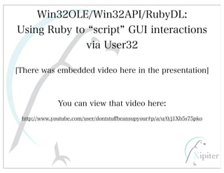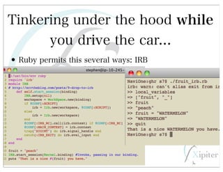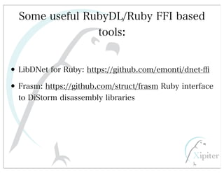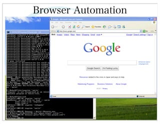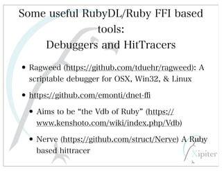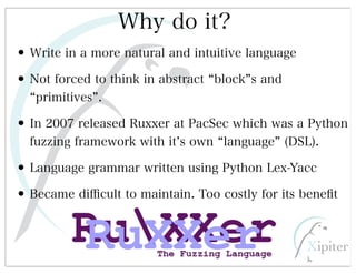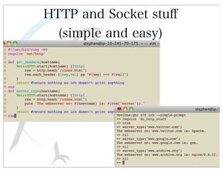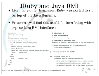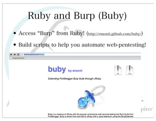 This document discusses automated HTTP verb tampering. It provides links to GitHub repositories containing code for modifying HTTP requests in Ruby, including changing the verb type and adding custom payloads. Specifically, it links to code that allows modifying the user32 library in Ruby, generating TLV packets to embed data, and a presentation on Ruby meta-fuzzing techniques and another GitHub project for HTTP request manipulation in Ruby.