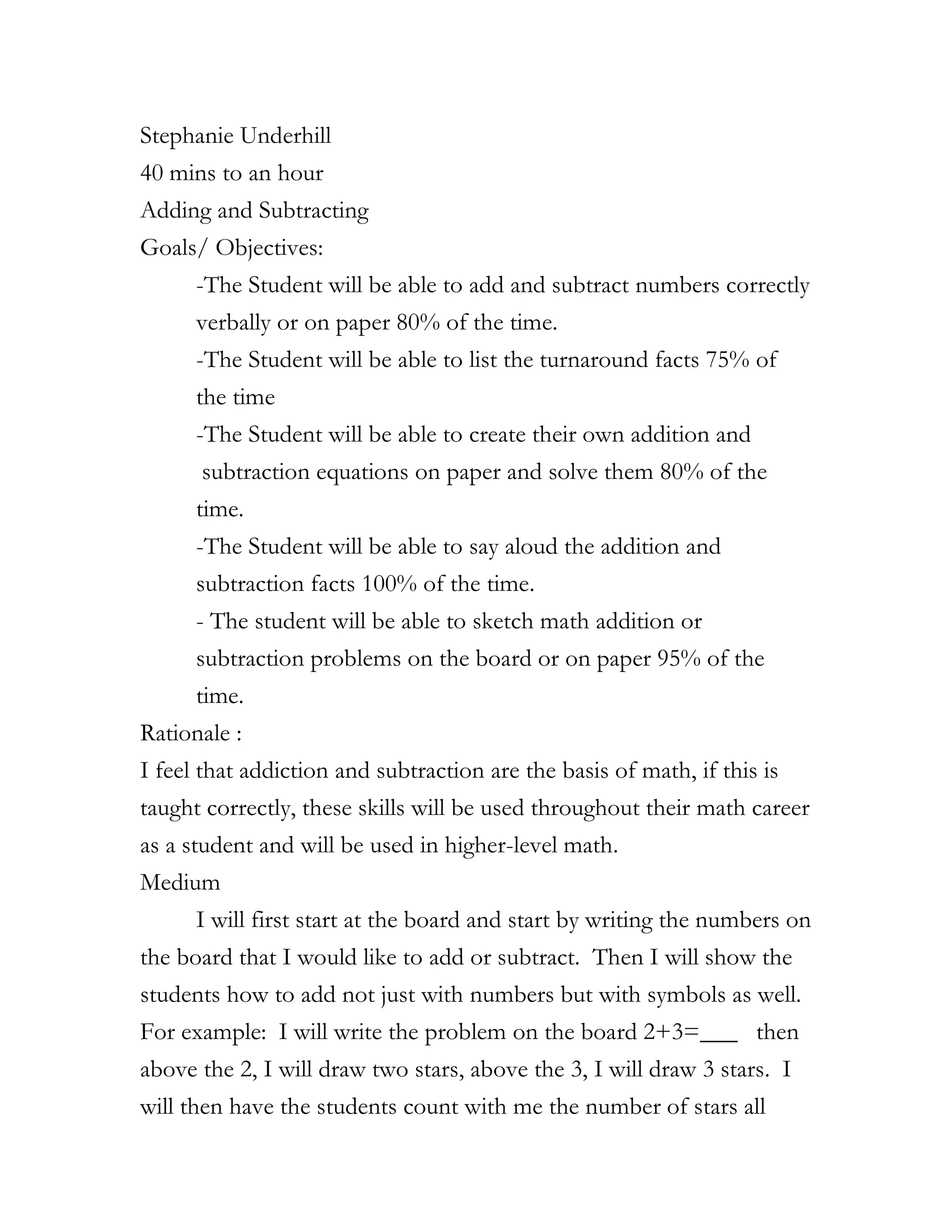 The document provides details for a 40-60 minute lesson plan on adding and subtracting for kindergarten/first grade students. The goals are for students to correctly perform addition and subtraction problems verbally and on paper at least 80% of the time, list turnaround facts 75% of the time, and create and solve their own math equations 80% of the time. Technologies to be used include iPads, Kidspiration, computers, and math game websites. The teacher will use visual examples on the board and have students do worksheets to assess learning.