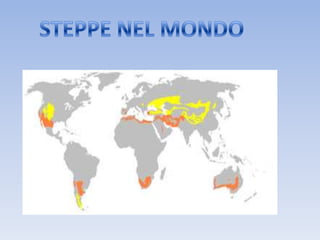 Le steppe sono vaste aree di vegetazione erbacea caratterizzate da un clima continentale e possono essere continentali o subtropicali. Le steppe continentali si trovano lontano dagli oceani, come la grande steppa euroasiatica, mentre le steppe subtropicali si estendono in diverse regioni del mondo. La fauna è ricca di grandi mammiferi mentre la vegetazione è prevalentemente erbacea e povera di alberi, con popolazioni nomadi di pastori che allevano vari animali.